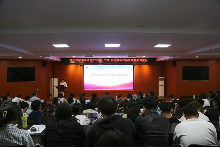 活动伊始,师生们通过视频共同回顾了我国推普工作三十年来的发展历程以及所取得的辉煌成就,并分别欣赏了第七届中华经典诵读大赛(陕西赛区)二等奖获得者我们学子刘子佳,以及校级第七届诵读大赛一等奖获得者罗驰同学的获奖视频,让在座的每一位同学深切体会到语言文字在传情达意方面的无穷魅力。随后,中文系教师李军学和薛红娟分别作了《语言的奥秘》和《普通话与方言之间》的主题报告。