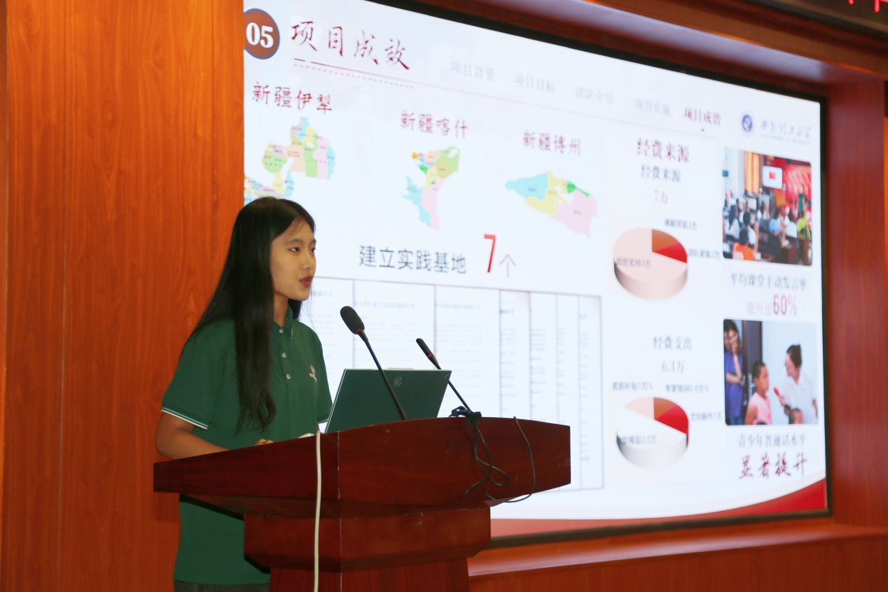 随后,bv1946伟德官网法学系李奕霏同学生动讲述了自己今年参加由梁雪蓉老师申报获批的教育部国家通用语言推广项目“秦疆心语服务队”的经历与体会,分享了他们远赴新疆各地推广普通话的动人历程,他们将推普工作与非遗体验、科技实验、书信交流相结合,打造“沉浸式”课堂,助力千名青少年提升语言能力的动人故事,以及收获的各项荣誉。她的讲述让在场师生深切感受到了推普工作者的热忱与奉献,看到了他们的辛勤耕耘所结出的累累硕果。