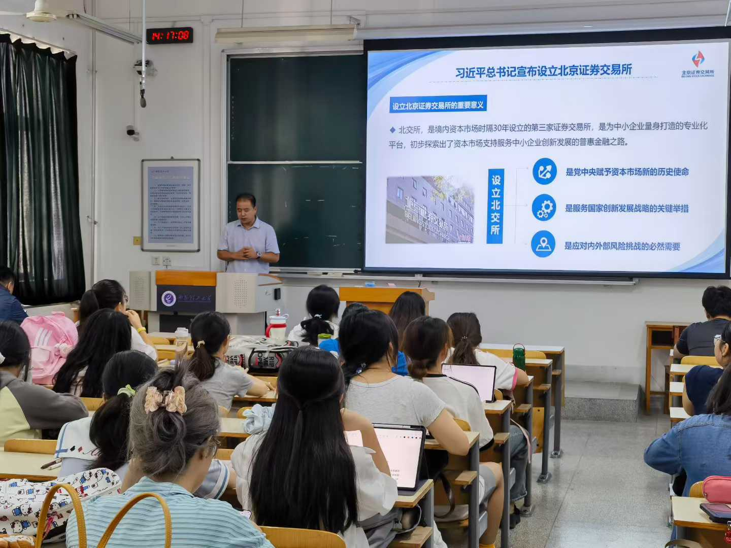法学学科具有鲜明的实践性特点,为有效提升办学特色,我们法学专业采取积极措施不断提升实践教学水平,与中国证券业协会、中国证券监督管理委员会陕西监管局、西部证券股份有限公司签署了合作协议,共同构建“一会、一局、一司、一校”长效合作机制。作为落实合作机制的最新成果,西部证券与北京证券交易所精心准备了证券金融法前沿知识专题讲座,委派专家于近日赴我们开展实践教学讲座。讲座反响热烈,获得了师生的一致好评,法律系主任王军主持了本次活动。