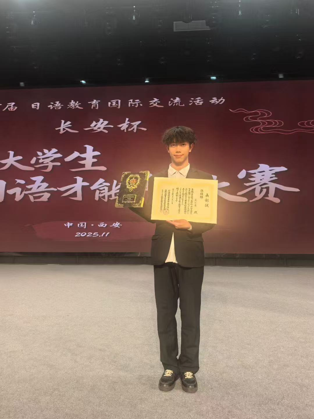 比赛设有命题作文与主题演讲两个环节,旨在考察选手的语言应用能力、逻辑思维与跨文化表达水平。我们2024级日语专业学生袁子昊同学凭借扎实的语言功底与富有感染力的演讲,荣获陕西高校组二等奖的佳绩。指导教师为日语系铃木雅子老师和唐楠老师。