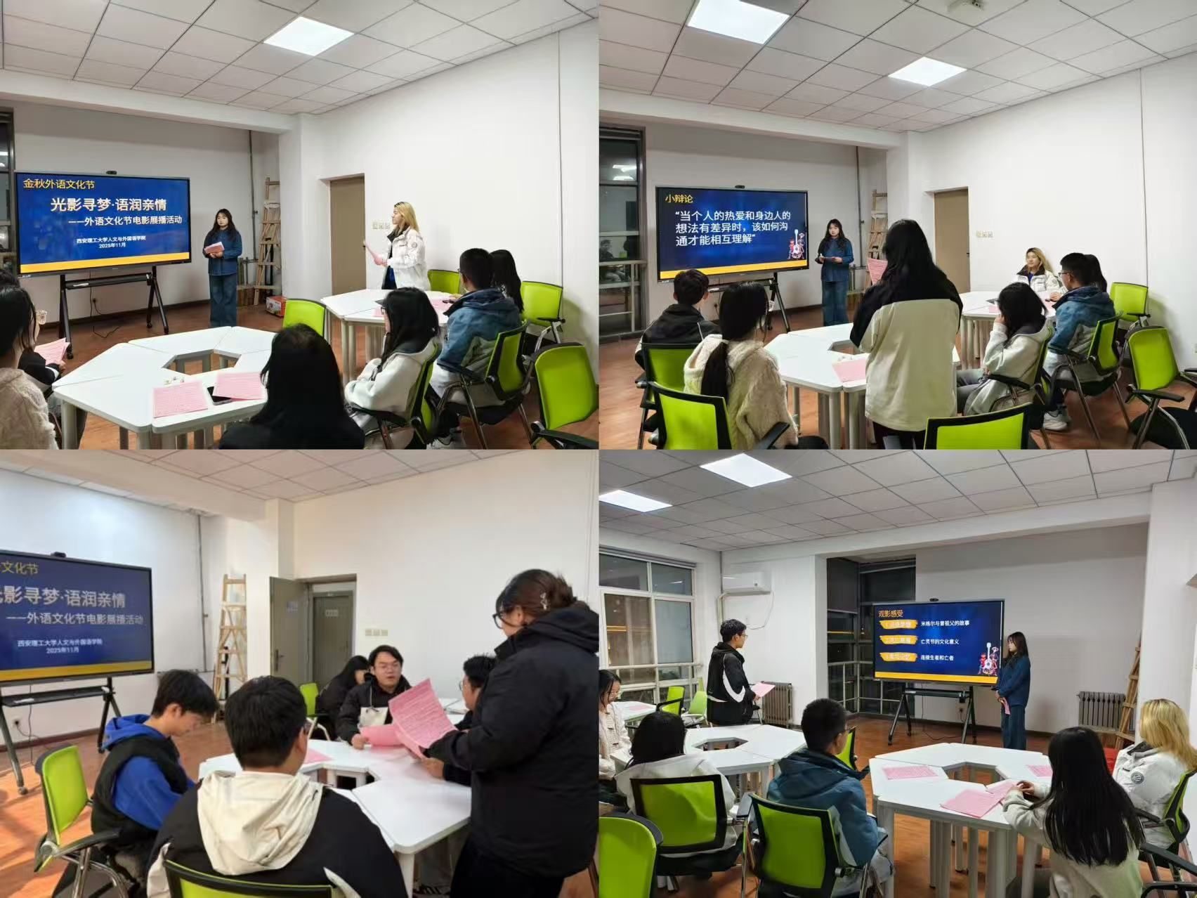 在随后的主题讨论环节,同学们围绕“亲情的联结与传承”“语言学习与文化理解”等议题展开热烈交流。大家结合自身外语专业背景,积极运用英语分享观点,从影片中关于家庭、记忆与梦想的描绘出发,探讨亲情陪伴、相互理解与关爱支持在个人成长中的重要意义。现场发言踊跃,气氛温馨而深刻。