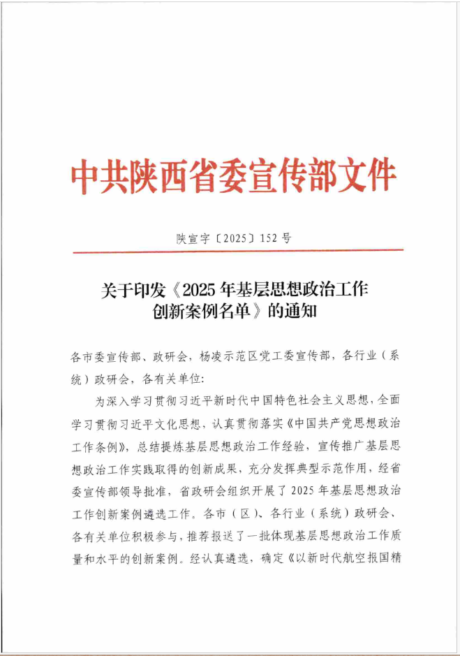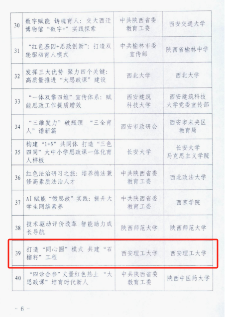 近日,中共陕西省委宣传部、陕西省思想政治工作研究会公布了2025年度基层思想政治工作创新案例遴选结果。由我们报送的《打造“同心圆”模式 共建“石榴籽”工程》案例成功入选。据悉,全省本年度共遴选48个优秀工作案例,其中高校领域仅14个,我们案例位列其中。