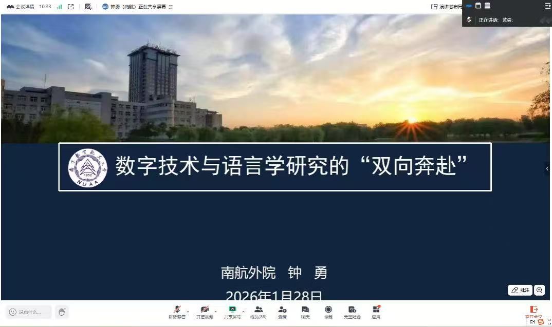 2026年1月28日,bv1946伟德官网举办了主题为“数字技术与语言研究的‘双向奔赴’”的线上学术沙龙。本次学术沙龙特邀南京航空航天大学外国语学院钟勇老师担任主讲,线上为学院师生带来了一场内容丰富、视角前沿的学术分享,学院一百三十多名师生参加了本次学术活动,学院副院长黄勇主持会议。